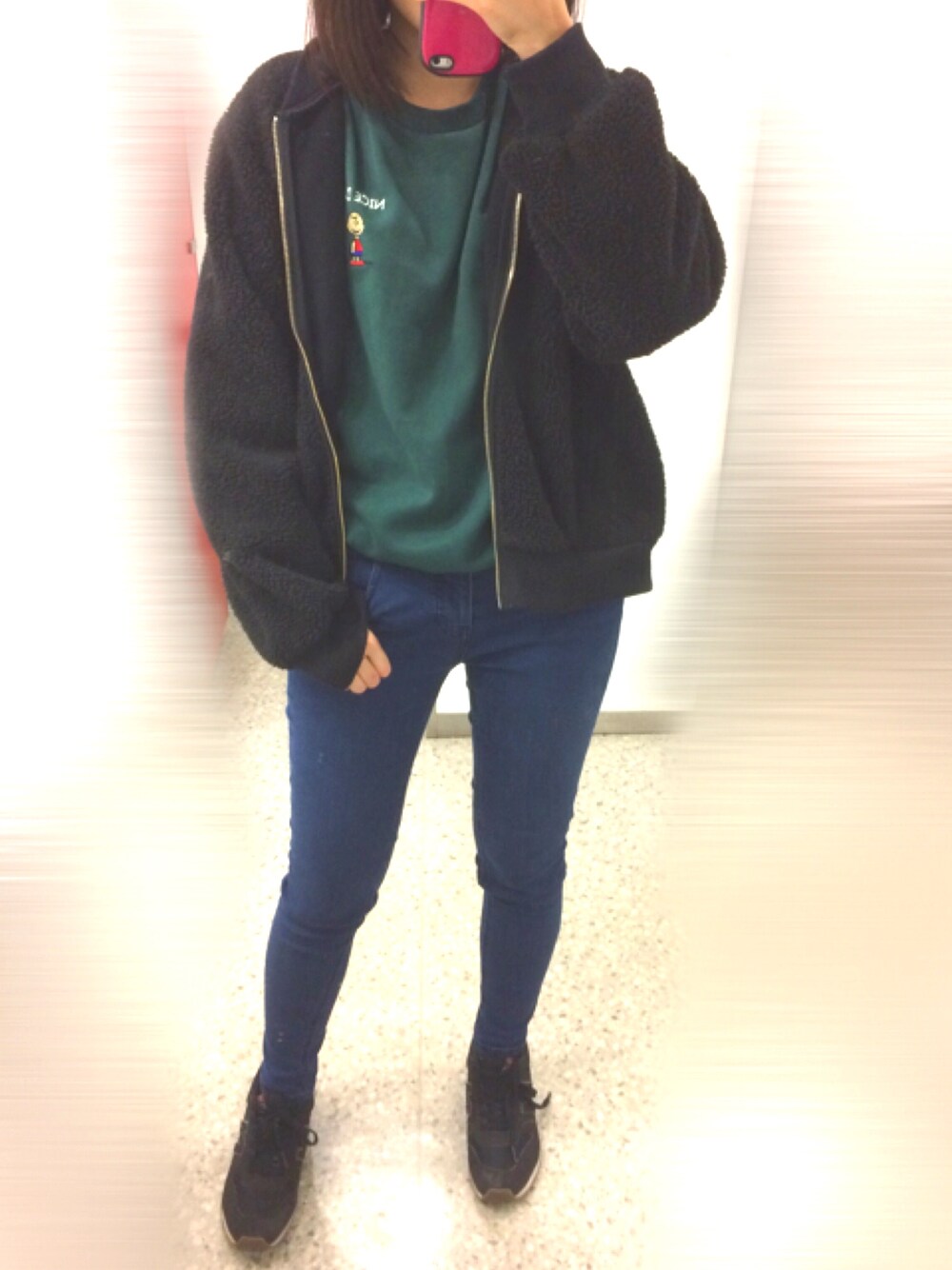 oldmickeyのスウェットとスキニーとGUのもこもこブルゾンでシンプル 韓国風🐻 GUのもこもこブルゾンはプチプラで暖かいので重宝してます🙃