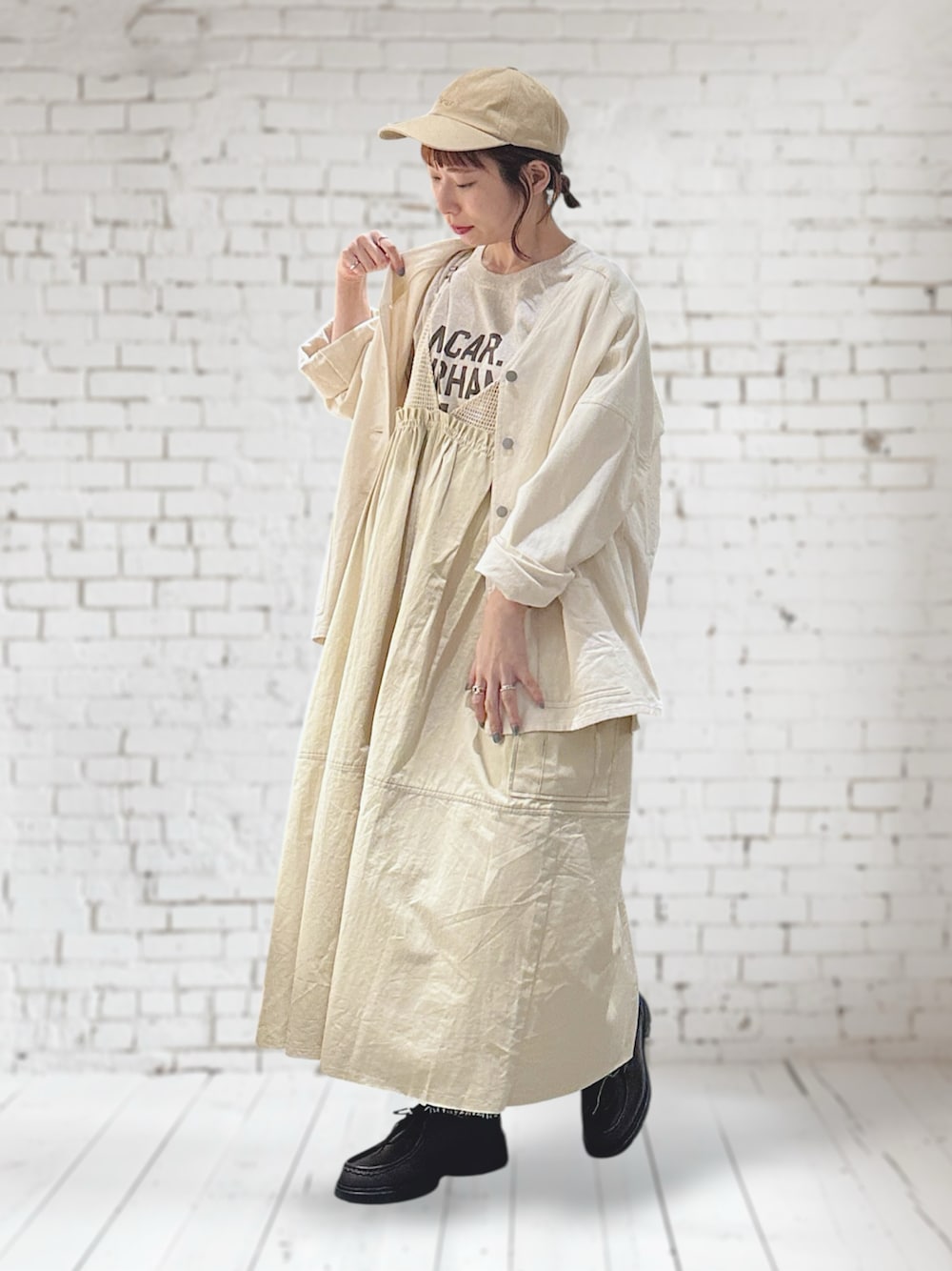 春は淡色コーデが好きなんだけど 中でも淡色×ミリタリーが大好物🤤🤍 Crispのワンピースは ☑︎たっぷりした身幅 ☑︎ゆるゆるで着られる着丈 ☑︎サイドについた大きなポケット ☑︎めずらしいメッシュの切り替え …と わたし得な仕様🫶