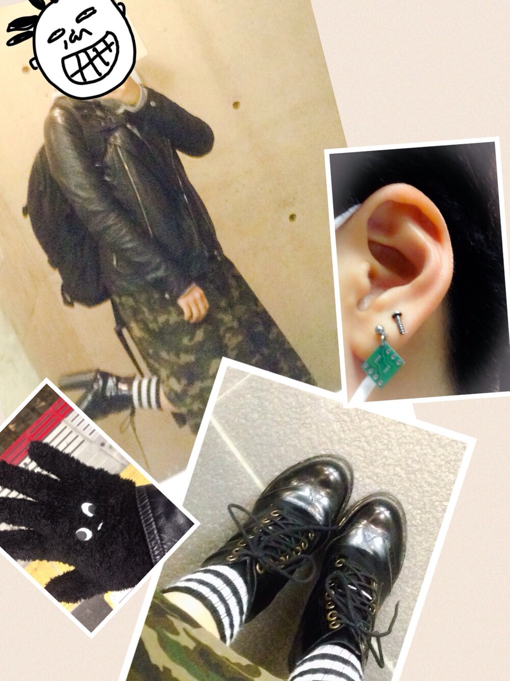 卒論提出が明日に迫りまして 確かアバンギャルドで買ったお気に入りの基板ピアス バイトの先輩にもらったぬくぬく手袋 店員さんに古着ですか?ってきかれたguのライダース 合わせやすくて履きやすいjeffreyのブーツ で、一日大学にひきこもってた