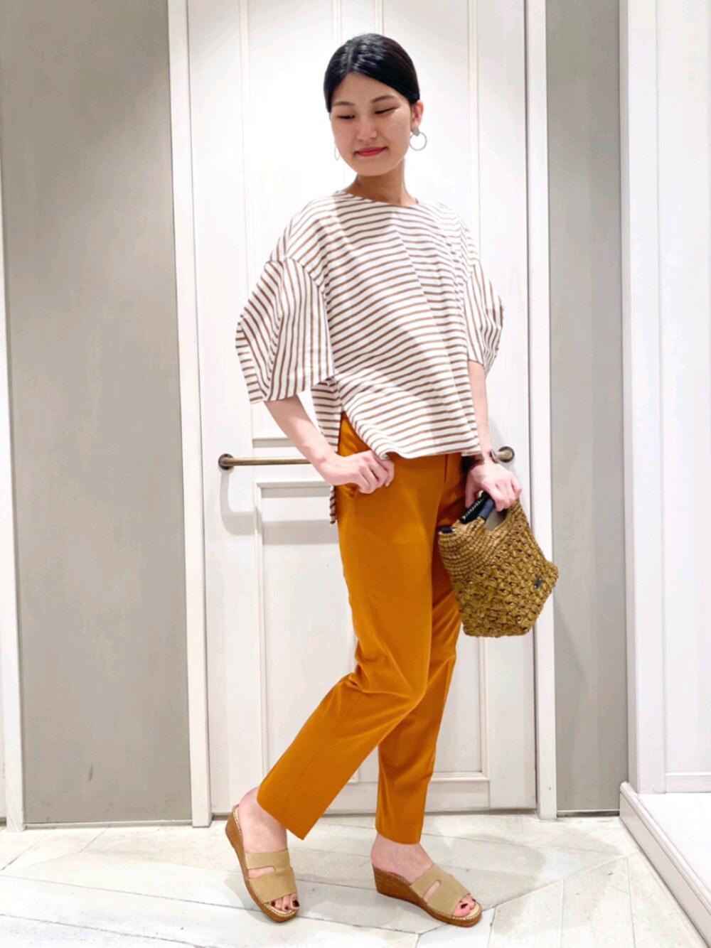 . ダークオレンジのパンツは穿きやさ抜群🌠🌠 上品なカラーパンツを使ったワントーンコーデに🤗 カラーや柄を使ったコーデはオシャレでテンションが上がりますね💓 .