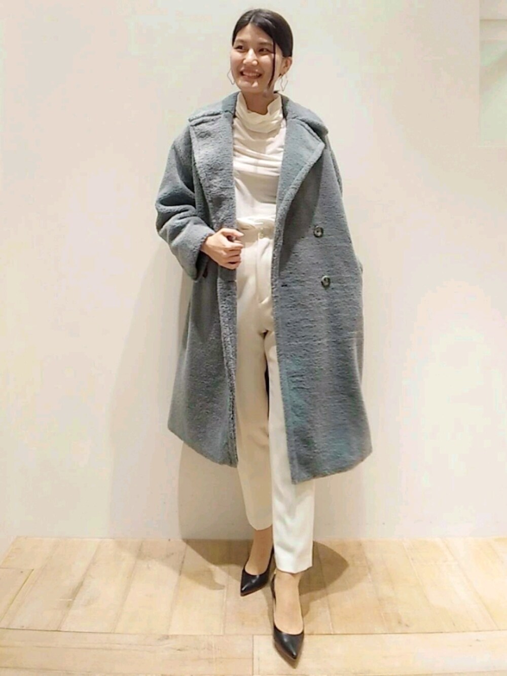 . 新作ボアコート😍 立体感のあるシルエットと素材です! インナーコーデはオールホワイトでシンプルに💛 コンパクトなトップスと細身パンツであわせると綺麗めに着られます! .