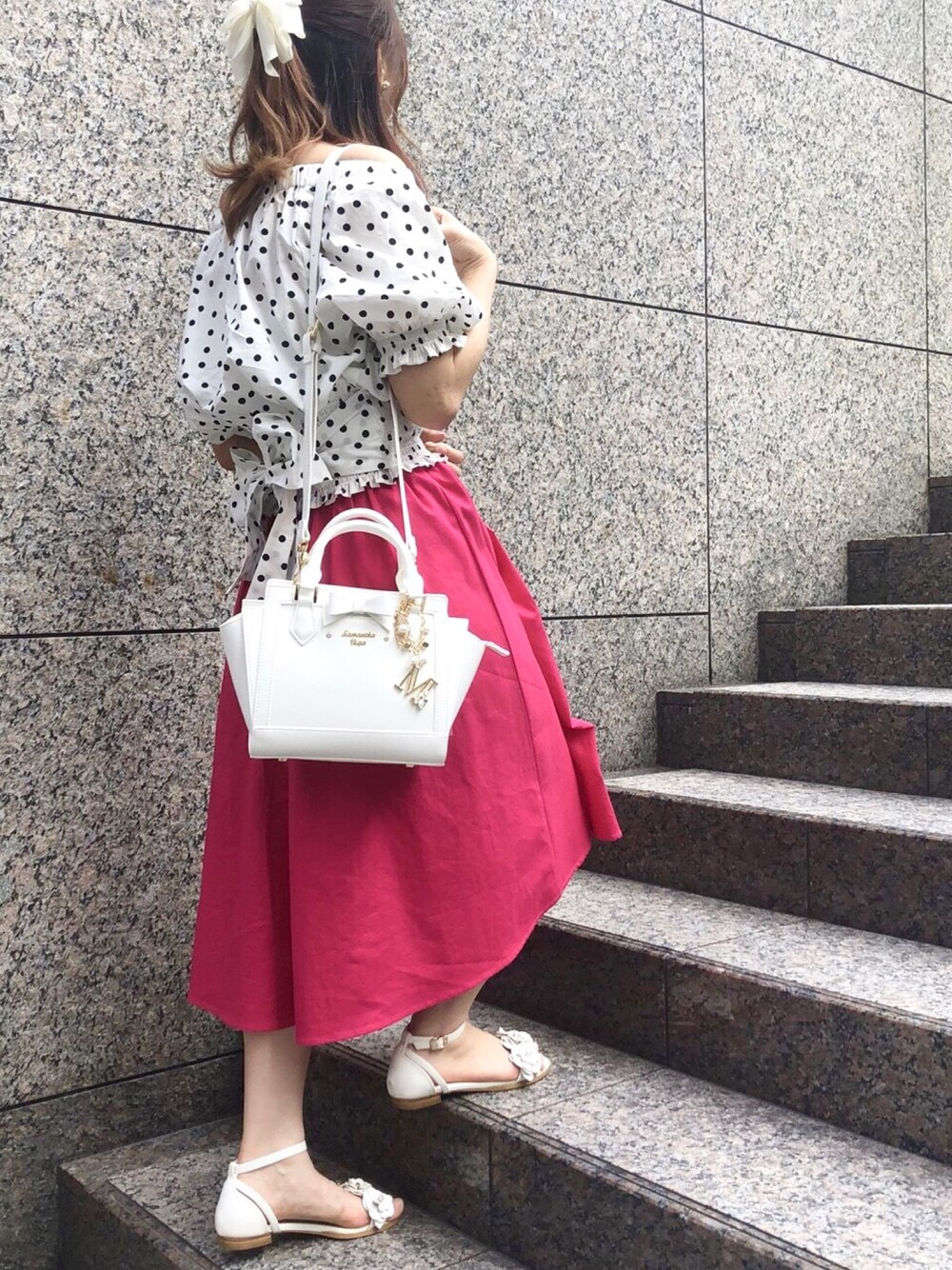 今日は可愛い系で☺︎❤︎ トップスの後ろリボンが可愛い❤︎後ろリボン大好物です❤︎ 小物は白で統一しました☺︎ このバッグ、リボンがパスケースなんです! そして中はイエローグリーンの爽やかなカラーとギャップが❤︎ 長財布も入る優れもののショルダーバッグです❤︎