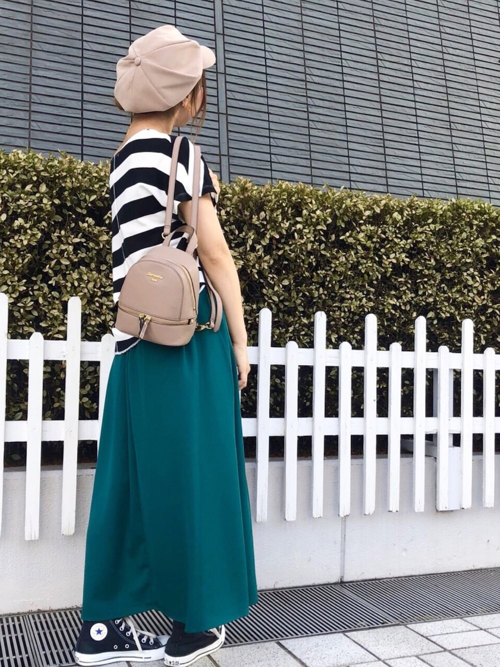 キャップがマリオと言われます😡笑 毎日暑いのでアップヘアがかかせません😢 ミニリュックがかわいい☺︎❤︎ベージュのリュックは年代問わず持てますね☺︎