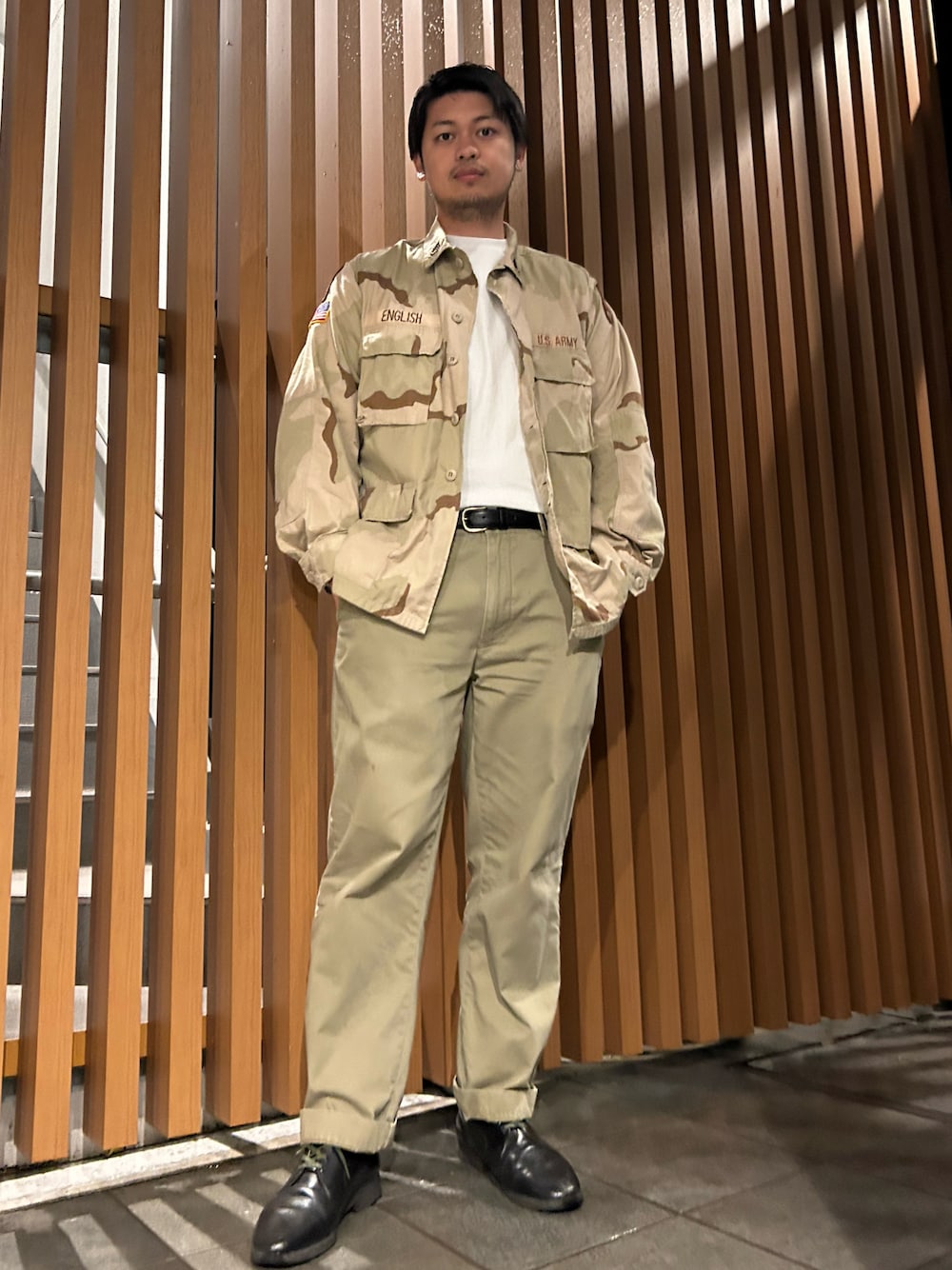雨の日の戦闘服 〜ポークステーキを喰らうために〜 . -------------------- jacket→Medium-Regular long t-shirt→XL pants→34 belt→30/32 shoes→29.5 socks→Free . -------------------- . ✔️Selected Item✔️ アメリカ軍 デザートカモBDUジャケット . 砂漠用の迷彩柄で3カラーデザートカモと呼ばれます。90年代初頭より支給が開始された比較的新しめなものです。 状態がまだまだ綺麗なものなのでクタクタにしたいものです。 . 🦓 この日は夜にポークステーキを食べに行く日で本来もう少し綺麗な格好をしたかったのですが、雨が降っていたので戦闘体制可能なジャケットを羽織り、お出かけしました。 下は初めて買ったポロチノです。