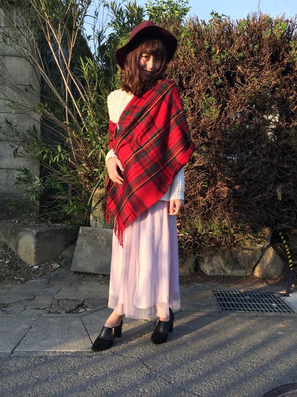 ピンク系のスカート、レッド系のハットを着用したレディースの秋コーディネートの1枚目の写真