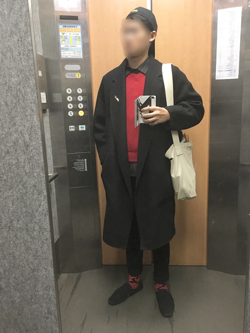 最早冬。 ニットオンシャツに薄手のコートもプラス。 赤と黒のシンプルなYラインで、外しにキャンバスバッグとHappysocks。 金が飛ぶ飛ぶ…