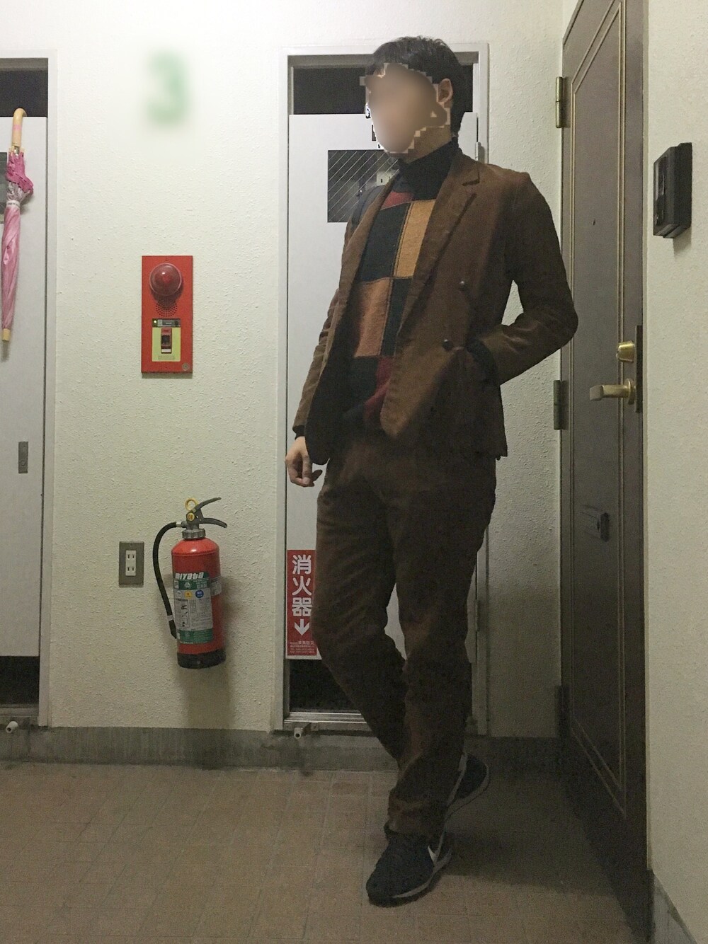 茶コーデュロイセットアップとパネルニットの茶コーデです。 やっと黒以外のセットアップが手に入った!
