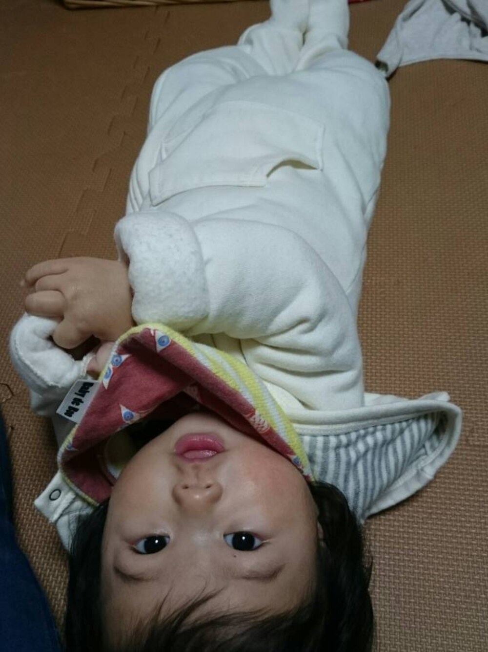 コーディネートってほどのものじゃないですが… ちょっぴり外出する用に姉が赤ちゃんの頃着てたクマの服を着せてみました。