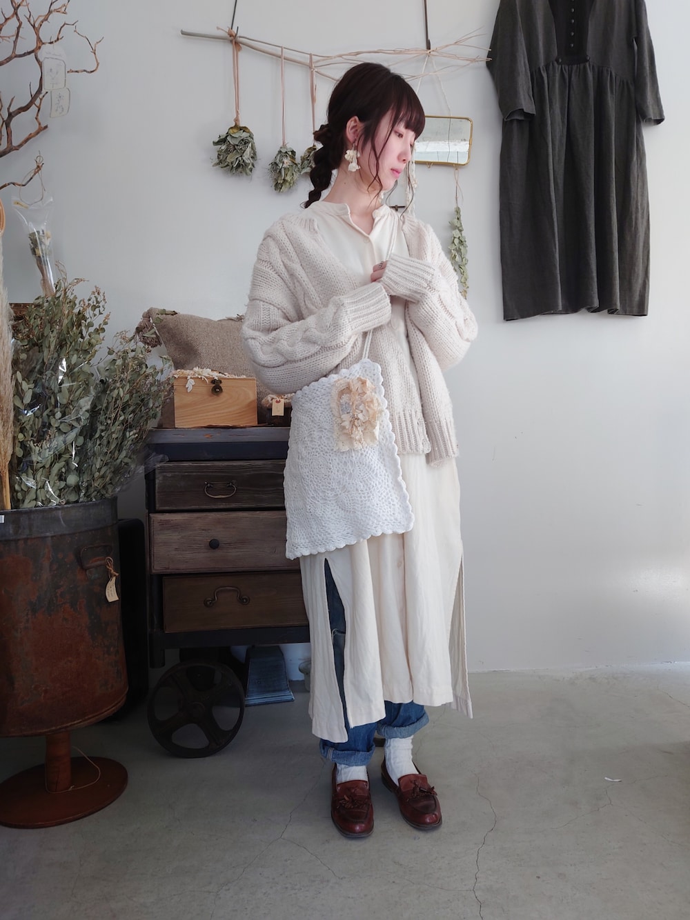 スタッフコーディネート* 少し暖かくなってきた春のお出かけに♩︎ m.soeur online shop限定販売中の レース編みショルダーバッグが 春コーデにおすすめです。 スワイプして→ アクセサリーコーデもチェックして下さいねー◎ イヤリングをヘアピンで髪につけた アレンジも*