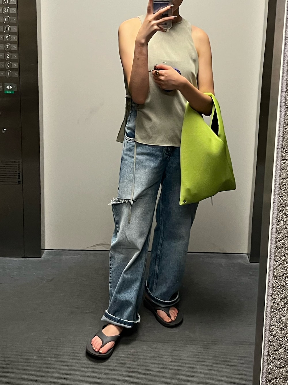 カバンを色物にして差し色に🟢 トップスは風通し良くておすすめです⭐️⭐️