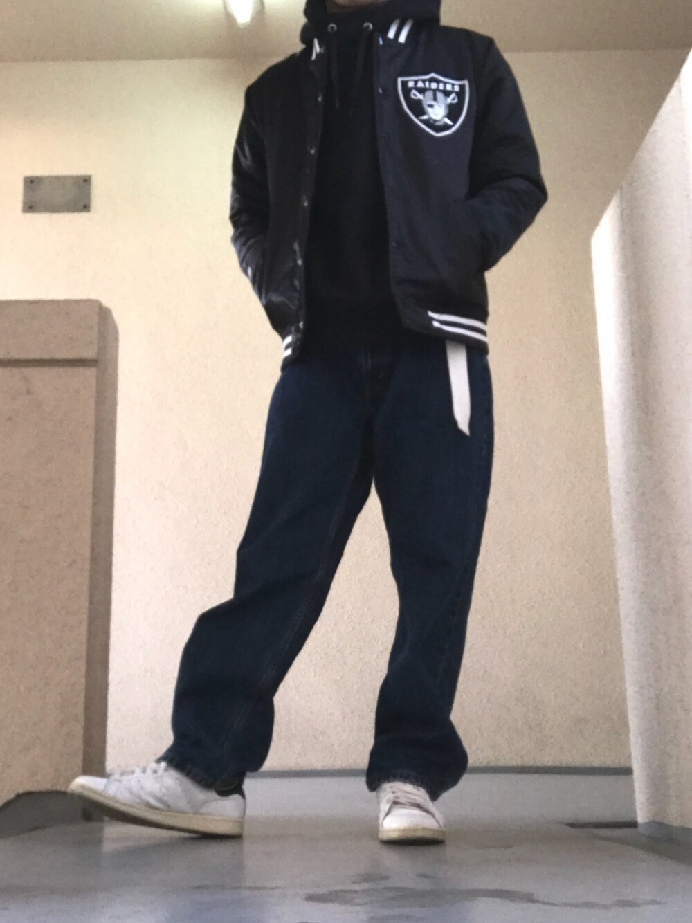 けっこう昔に買ったRAIDERSのスタジャンお気に入りです ちょっとストリートっぽい感じに! こう見ると靴の汚れが目立つ、、、