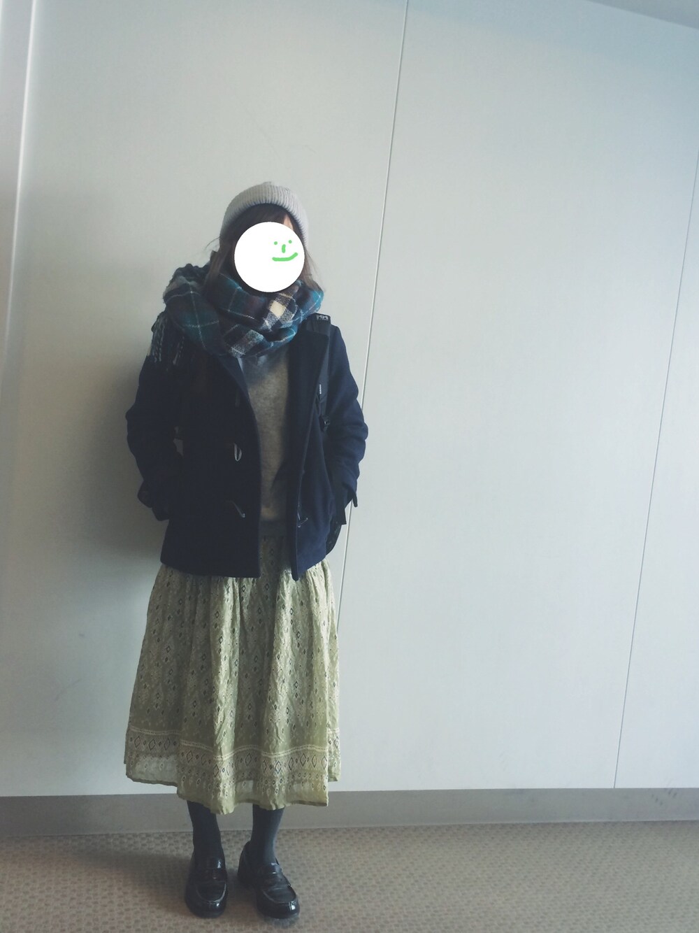 スカートの柄、こういうの何柄って言うっけ… グレーのカシミヤセーター 春スカート 紺のダッフル チェックマフラー ローファー グレーのニット帽