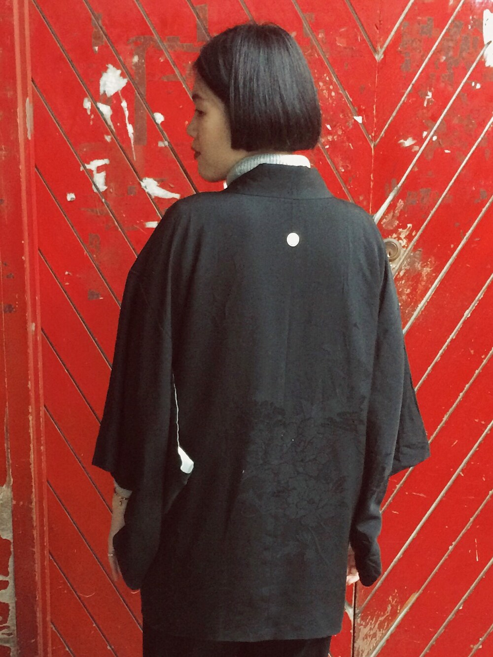 ブラック系の浴衣を着用したレディースの春コーディネートの1枚目の写真