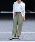 ヘリンボーンのようなプリーツが目をひくパンツ* ゆったり履けるのにキレイ見えするからTシャツと合わせるだけで可愛い! バックプリントが可愛いTシャツと合わせました◡̈