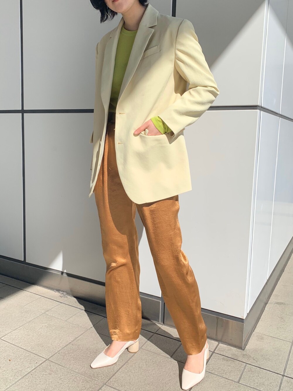 《笠谷有花:MAISONSPECIAL staff》 体型:普通/普段サイズ:M-L/着用サイズ38-FREE オーバーサイズのジャケットにキレイめなシルエットのサテンパンツで合わせました。カラーもイエローベースに差し色でグリーンをいれてました。 サイズ感:パンツは38を履いていますが、細身の方は36でも履いていただけると思います。