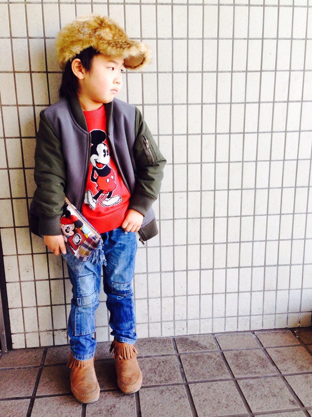 ご機嫌ななめさん🐻🍃 最近ヴィンテージシーツのリメイクにハマっておりまして✂️ とわっちにクラッチバッグ(もどき)を作りました🙌 大好きなミッキーさんで💓 気に入ってくれたみたいでよかった‼️