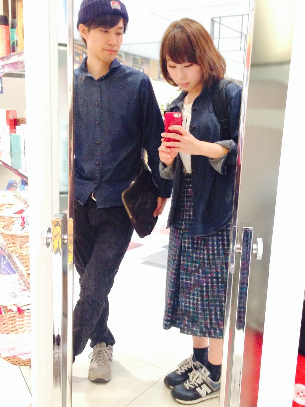 彼とお揃いのシャツ(私のは弟のもの) light onです〜 スカートは寒くて古着屋さんで買ったもの。 カラフルなツイードが可愛いです。 航空祭のために10年ぶりに肩につくほど髪を伸ばしてみた。けど、ボサボサ!やっぱり切りたい〜😢💫💫