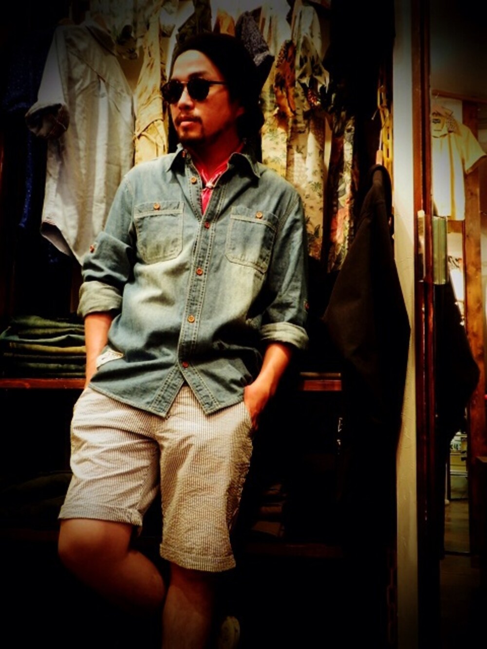 Outer:CONFUSE 「Ones word limitation product 」 デニムシャツ ¥5,292 Inner:「T-TOP」 ¥1,080 Bottoms:Sadistic Bear 「STRIPE SEERSUCKER SHORT PANTS」 ¥9,504