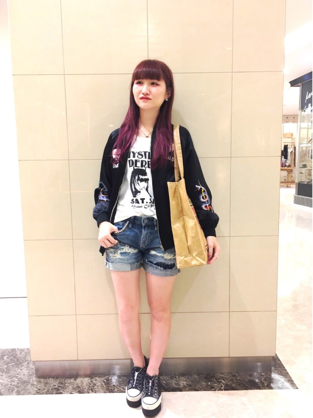 今年も流行りのスカジャンは刺繍が効いててかっこいいです!!ショーパンとTシャツでコンパクトに\(^o^)/ペーパーバック風のトートも可愛いです♡