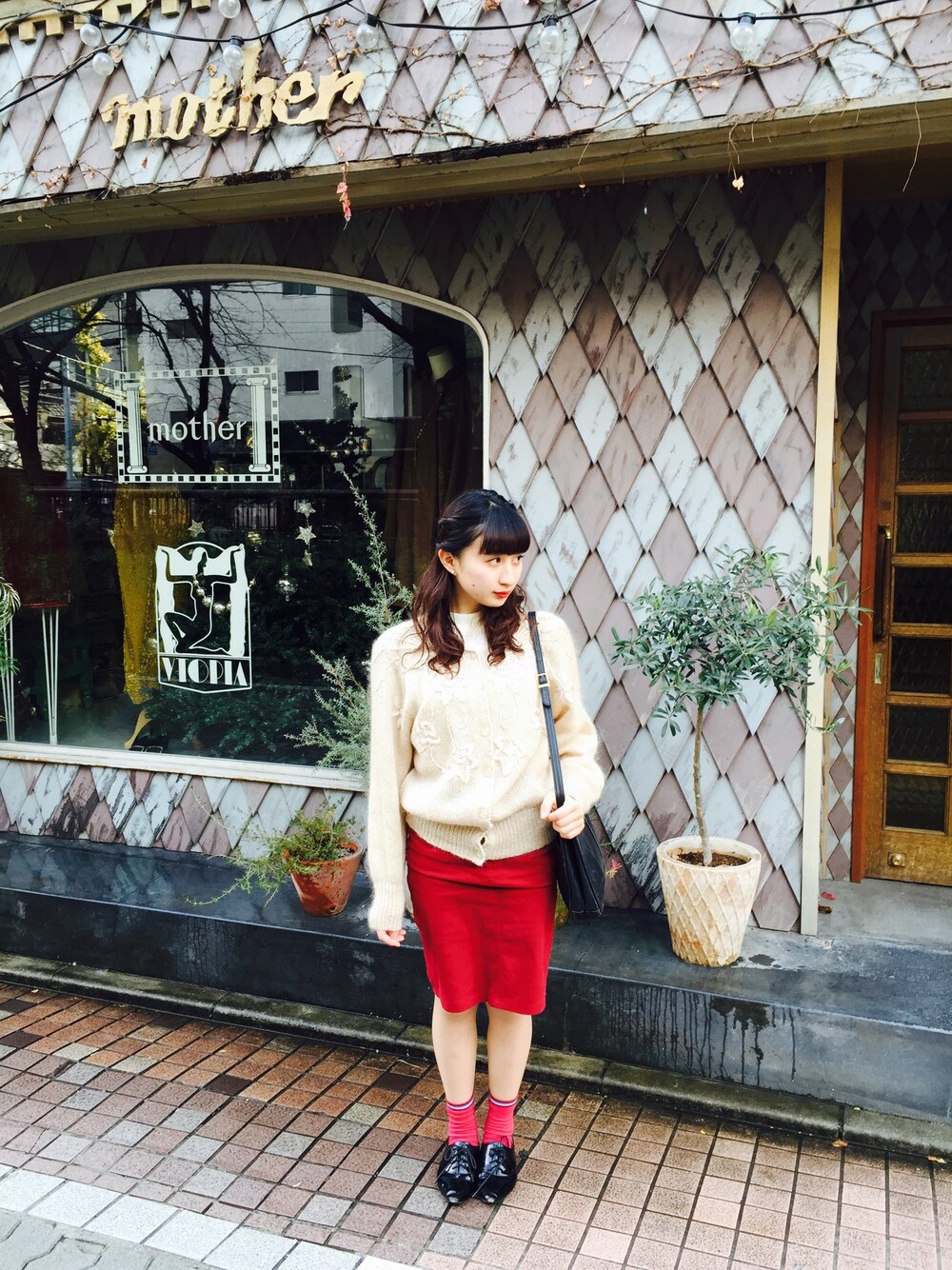 ニットコーデがしたくて、おばあちゃんからもらったおっきいニットに赤いスカートでガーリーに👧🎀 この日着てるものは足元以外、ぜんぶUSED この日、中目黒のmotherに初めて来店。商品が可愛くって仕方がなかった。お金貯めたら自分へのご褒美としてなにか買いたいな🙌💞