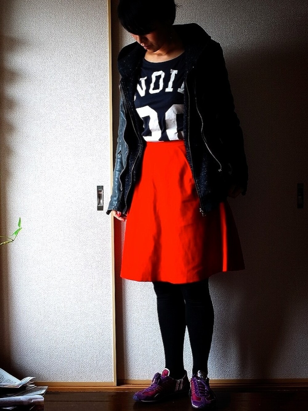 古着の赤スカートにベルシュカのナンバーTとスニーカー。