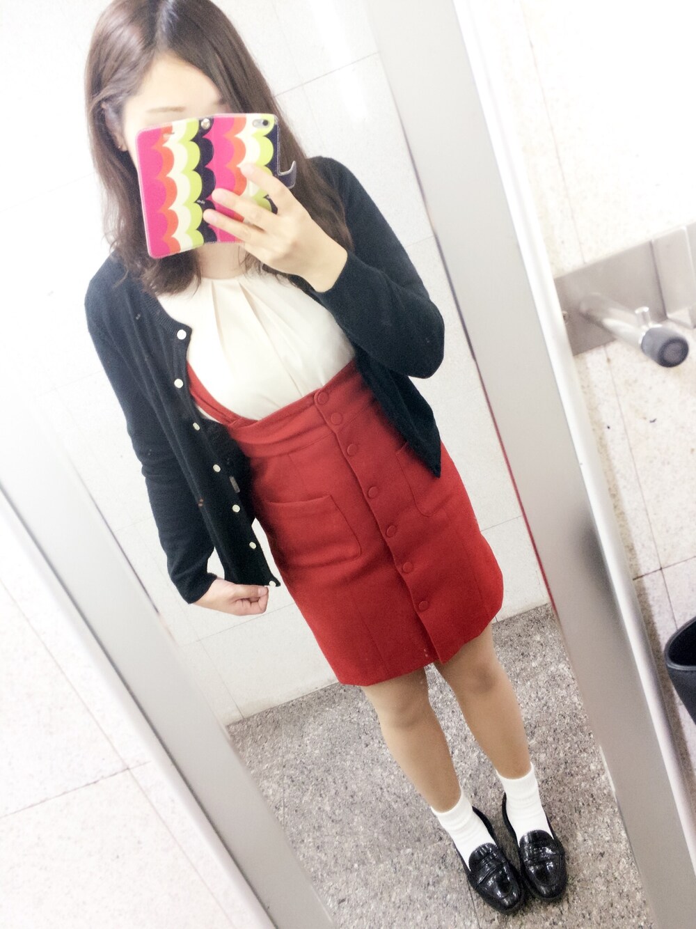 久しぶりに赤のタイトスカートを履いてみました。サスペンダーがついていて、上着を羽織らないそのままでもかわいい、お気に入りの一着です。