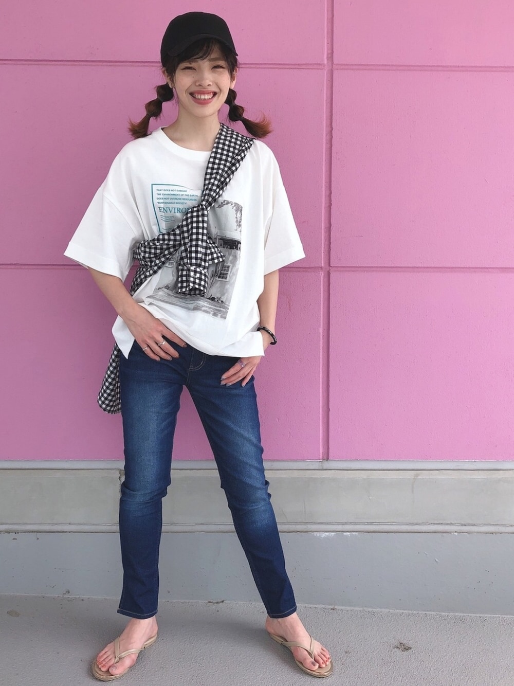 Tシャツはトレンドのビックシルエットでフォトデザインが胸元に大きく入っているのがかわいいです☺︎❣️白Tシャツにシンプルなデザインなので合わせやすさも◎ 今回はサイドスリットデニムと色が少し濃い目のパンツと合わせてみました! 細身のテーパードパンツで丈は160cmの私で足首が見えるくらいになるので、全体的なシルエットがスッキリ見えます😙☑️ ワンポイントにチェックシャツを肩からかけてみました★ insta→@mtm_right_on
