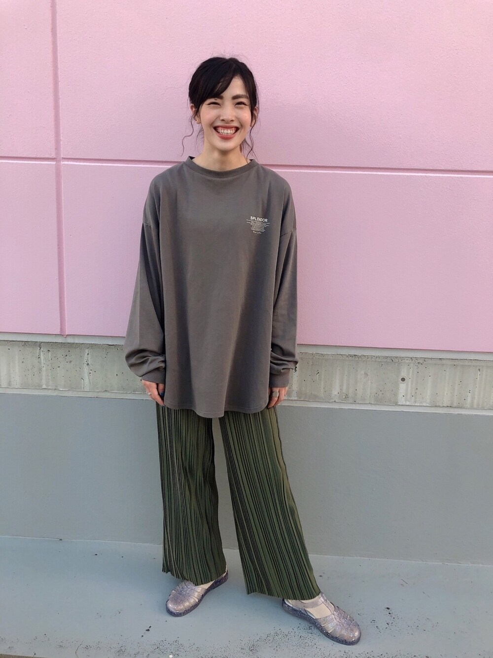 バックフォトロゴプリントロンティ✖︎ホソプリーツパンツ 旬のビッグシルエットロンTです🥰 ラウンドスリットでさらにトレンド感アップ👯♀️🌈 フォトデザインもシンプルなので、幅広い年齢層の方にきていただけます🙂⭐ ドロップショルダーで袖が手首のところでたまるのがまた可愛さアップになります❣️❣️ プリーツパンツは透け感がないので安心して履いていただけます!足首が隠れるぐらいの長さで、シルエットとしてはワイドまではいかないストレートな感じです!なので上がゆったりとしたトップスでもだらけて見えないのがポイントです😚👍💚💚