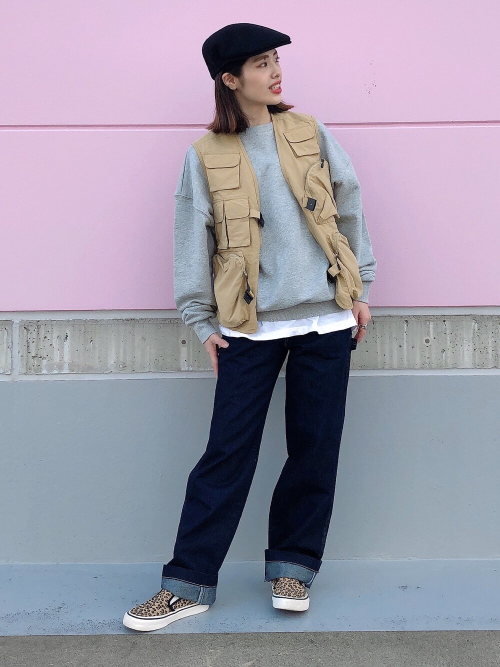 メンズライク🦺🛹♡ トップスのcamp7のトレーナーはMサイズを着用しています。着丈はそんなに長すぎず腰あたりですが、身幅は少しゆとりのある感じで、肩もドロップショルダーになっているので、袖も手首でダボっと溜まる感じです😌❣️ camp7のフィッシングベストはMを着用しています。ポケットがたくさんついているのがポイントです💁🏻♂️🧡 ボトムはLEEのペインターパンツ。着用サイズはSです。 メンズライクファッションには一つあると便利な一本になっています! 骨盤からゆったりとしたシルエットでストレートになっています!