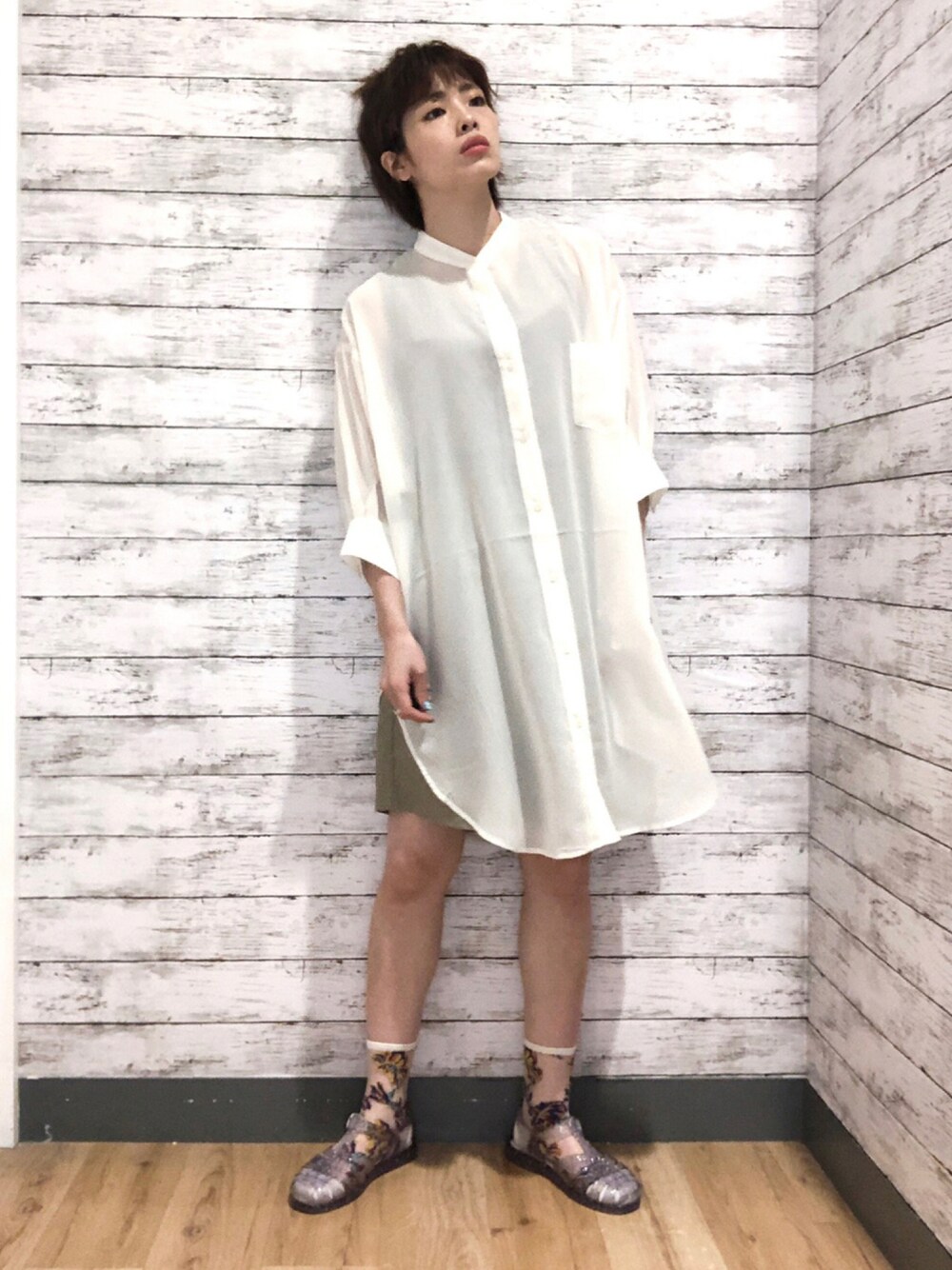 シアーシャツとハーフパンツで夏らしい大人っぽいコーディネート🌴🤍 シャツは【シアーシャツ】を着用❕ 絶妙な透け感と眺めの丈、そしてノーカラーのシャツデザインでトレンドデザイン満載🔥に作られたシャツアイテムです❕丈感が長めになっているため、スタイルアップや体型カバーにもなるのが特徴です🥺🌟 3色展開でどの色も大人っぽい淡いカラーなので1枚でかっこよく、落ち着いたようなコーディネートが楽しめます🎶 ボトムス👖は【ベルト付きショートパンツ】を着用❕ ウエストゴム仕様で穿きやすく、ショートパンツでも少し長めの丈なので着こなしもしやすいです(>_<)💕 麻混の素材を使用しているのでとても快適に履いていただけます❕ 落ち着いたカラーを3色展開し、大人っぽくコーディネートが楽しめます👡⭐️