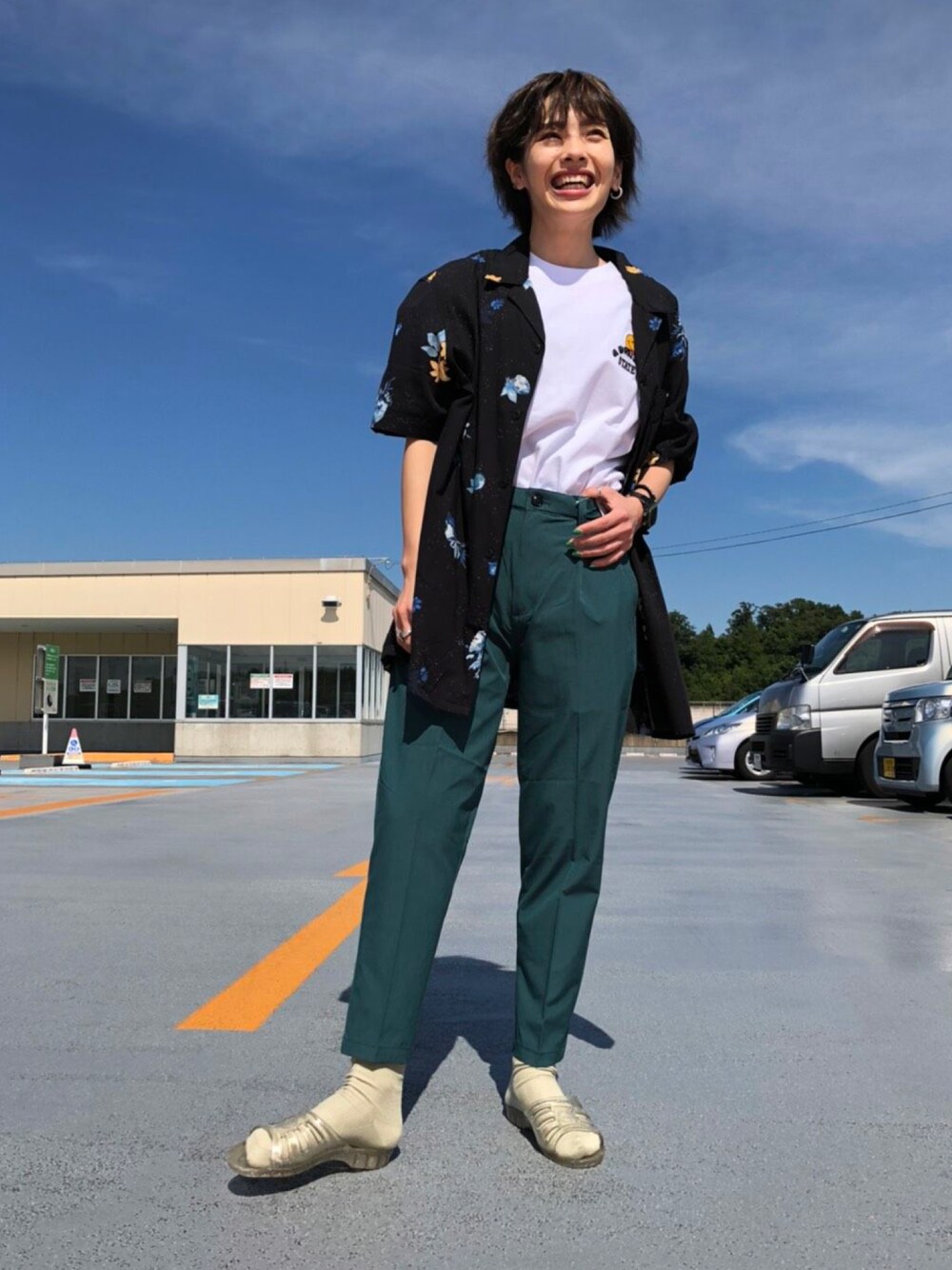 夏らしくアロハシャツで快適コーデ🎆 シャツは【Levi'sのキャンプシャツ】を着用🏕 サマーシャツで生地感がさらっと、柔らかいので一枚で着ても、インナーを合わせてかっこよく着こなしても決まる便利アイテムです🌻 オープンカラーなので首周りがしまってしまうのが苦手な方でも着こなしやすいのが特徴です❣️ 黒でかっこよく着用できるアイテムですが、花柄✿がデザインされているため、女性が着てもメンズライクにカッコ可愛いを演出できます😍 身長160cm🧍でMサイズを着用して、ヒップより下の丈感になります💁🏻 インナーは【Levi'sのバックプリントTシャツ】を着用😀 胸元にポップなロゴがついていて、一枚でサマになるデザインとして大人気アイテムの1つなんです❗ 綿100%の素材🧵で作られているので汗を書いてもベタつかず、柔らかい生地感が魅力的🥰 肌が弱い方でも安心して着ていただけるのもこのアイテムの特徴です❣️ カラーは2色展開で、一番着こなしやすい白と黒です💕 夏場人気の白を選ぶか、イメージチェンジで黒を選ぶか…どちらもデザインは可愛らしいので着回し用にカラー違いでご購入される方もいらっしゃるので、是非チェックしてみてください! ボトムは【DRYアンクルイージー】を着用🤹 チノパンのようなパキっとした質感に見えますが、柔らかくストレッチが入っていてきれいめコーデにもってこいなアイテムです😎✨ 緑色は特に女性でも、若い方でも人気のカラーなのでぜひご試着いただければと思います🌟 サイズはSサイズを着用して、ちょうどアンクル丈になっています💁🏻 ☟︎下の商品のアイコンから🛒へ入れる事ができます♪