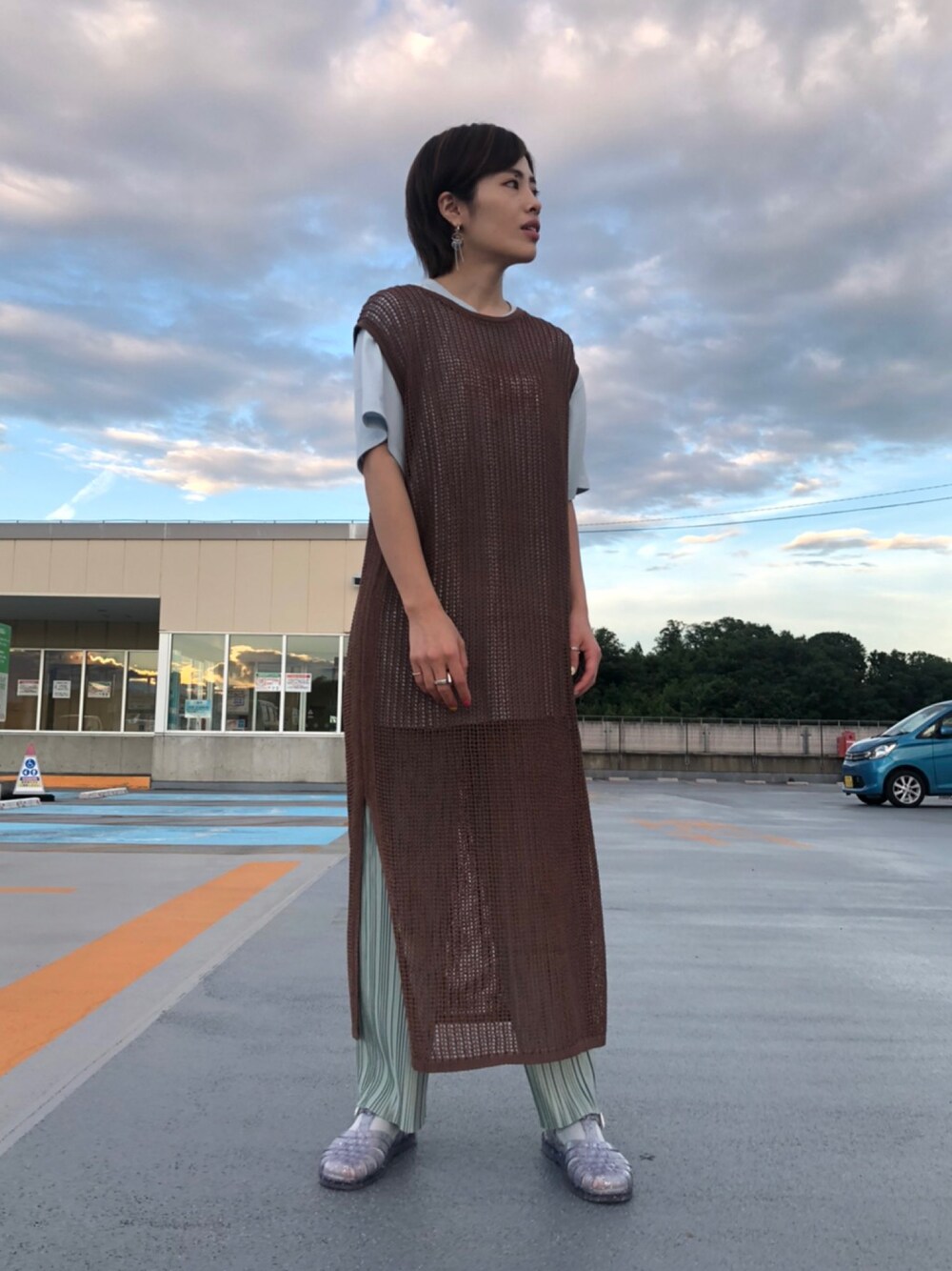 大人っぽいラフなコーディネート☕️🤎 トップスは【グラフィックTシャツ】を着用。ブルーのカラーと手書き風のフラワープリントが夏らしいデザインとなっております❕ ワンピースは【メッシュ編みワンピース】を着用。このようにTシャツに重ねたり、セットのタンクトップと合わせたり、色々なアイテムと合わせて着用可能です❣️ ボトムスは【細プリーツパンツ】を着用。Tシャツやブラウスを合わせるだけで、スタイリングできます❕ウエストもゴムになっているのでとても楽に履いていただけます(ᐡ•͈ ·̫ •͈ᐡ )。
