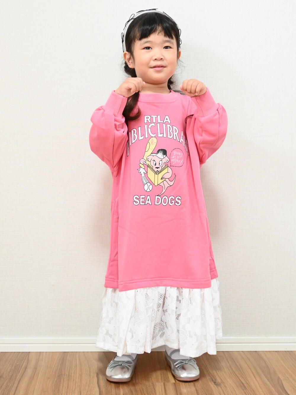 スウェットとレースのレイヤード風ワンピースはスニーカー合わせも可愛いけどよりガーリーにリボンカチューシャとリボンバレエシューズをプラスしました🎀 いいね、セーブ、フォローよろしくお願いします✨プロフィールTOPのURLからhenohenoオンラインショップへ飛べます✨