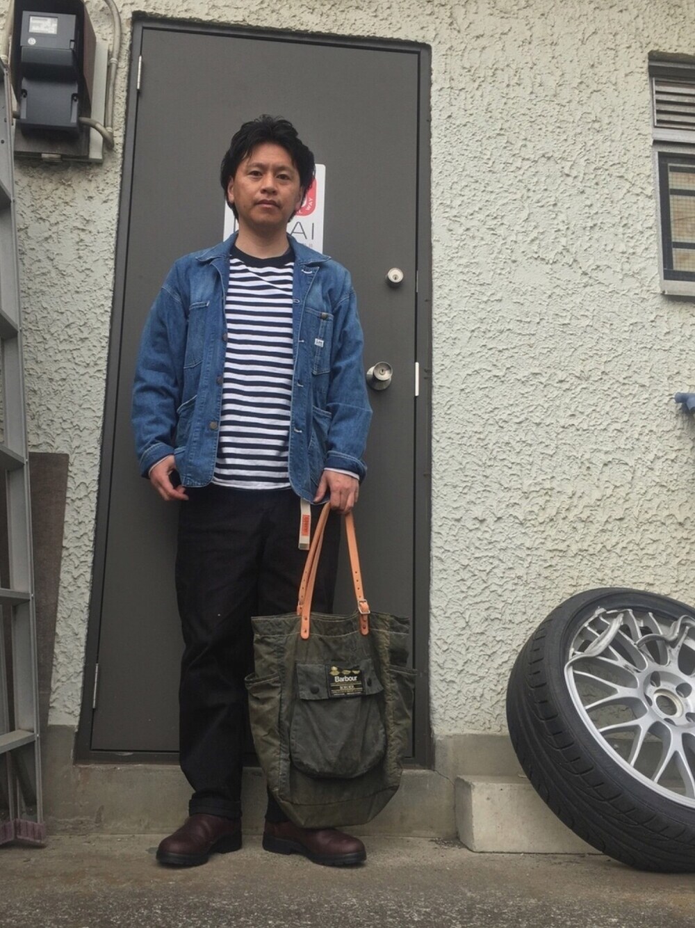 今日はベーシックな感じですが、なんだかんだベーシックな組み合わせが一番落ち着くししっくりきます。 でも今まではだいたいスニーカーだったのでWEAR始めてブーツ欲しくなって買ってからちょっと大人っぽい格好もするようになりました。 あ、十分大人、いやおぢさんですけど、、、 そんなわけでBarbour をリメイクしたトートを持ってみましたがヤラセです。(笑) 今日は普通にリュックで来ました。 なんかこういう格好ならこんなバッグが似合うかなと持ってみただけです。 これが私のオトナなイメージ⁈(笑)