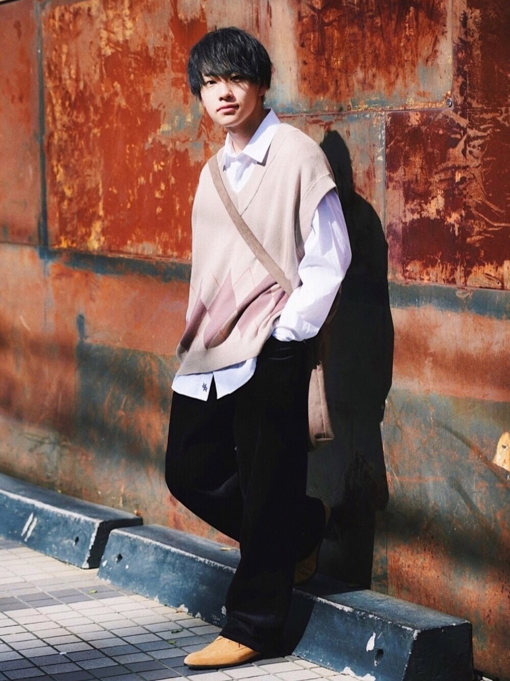 定番であるベスト×シャツの重ね着コーデもオーバーサイズにすることでトレンド感がアップ🙌 白シャツをレイヤードすることで上品に見え、清潔感とさわやかな印象になります 🤤 model;たもん