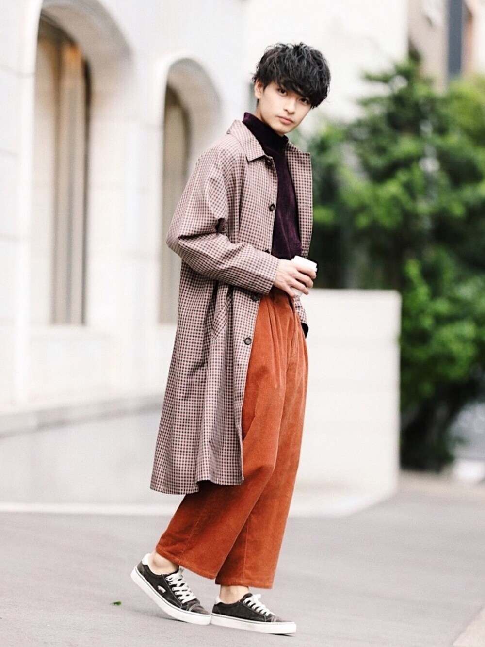 チェック柄のコートとオレンジのコーデュロイパンツで秋らしさを演出しました🤗 足元はローカットスニーカーで外すのが👌✨