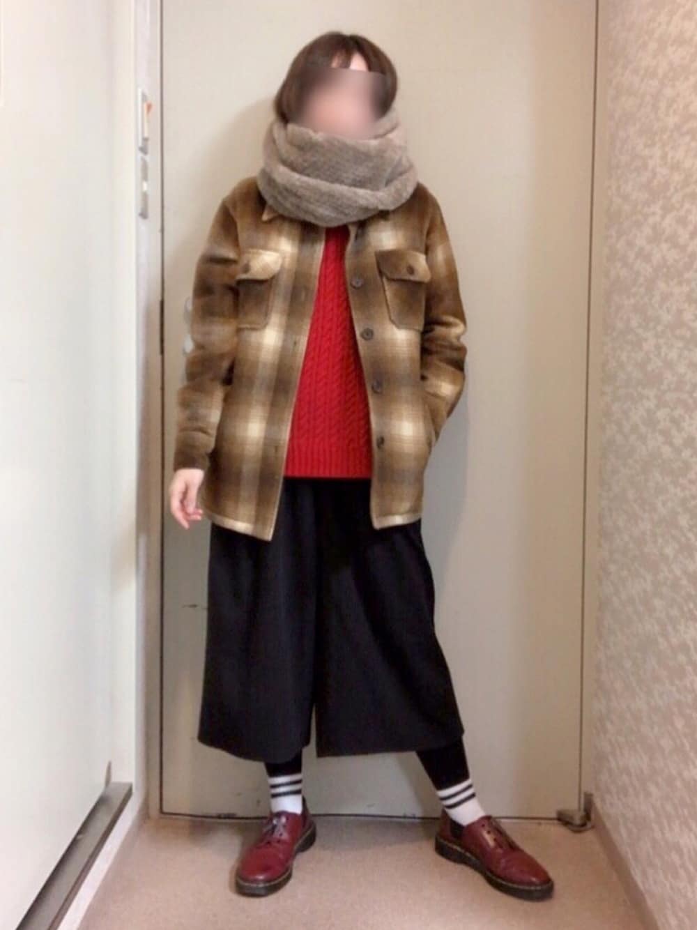 おはようございます☀️ 閲覧いただきありがとうございます😌 またまたチェック×赤コーデ🧥🔴 前はデニムを合わせましたが今回はキュロットパンツにしました👀 このキュロットパンツにはラインソックスを合わせがちです🧦 初めはアウターの柄派手やしなぁ、とか思ってたけどもう慣れてきました🙆♀️笑
