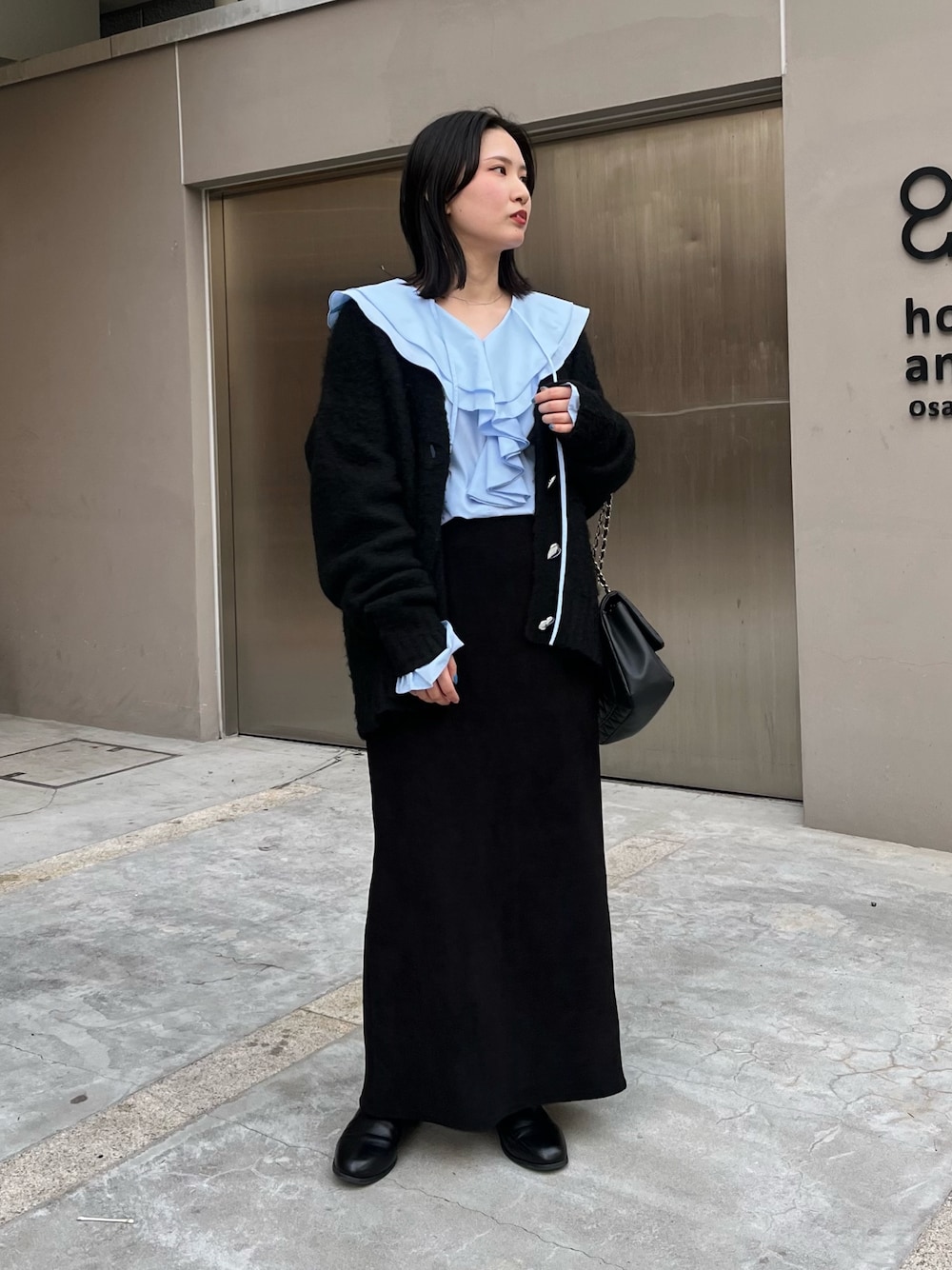 カーデにブラウスをレイヤード! ナロースカートでスッキリまとめました◎