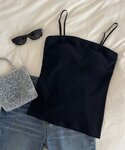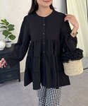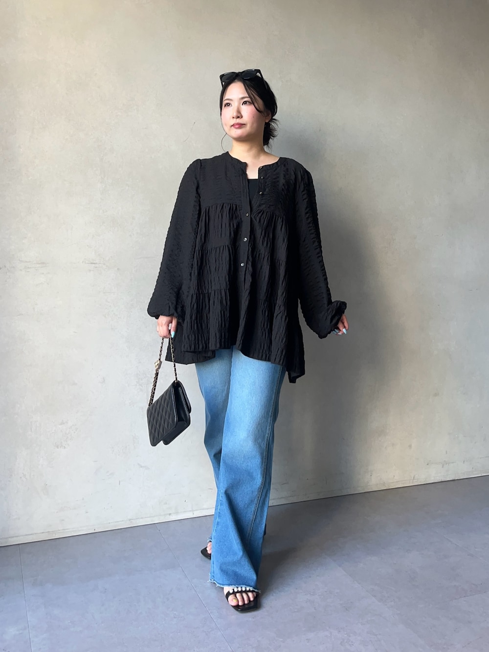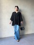 ボタンを3つ開けてキーネック風に◎ パンツもトップスもMサイズ着用。