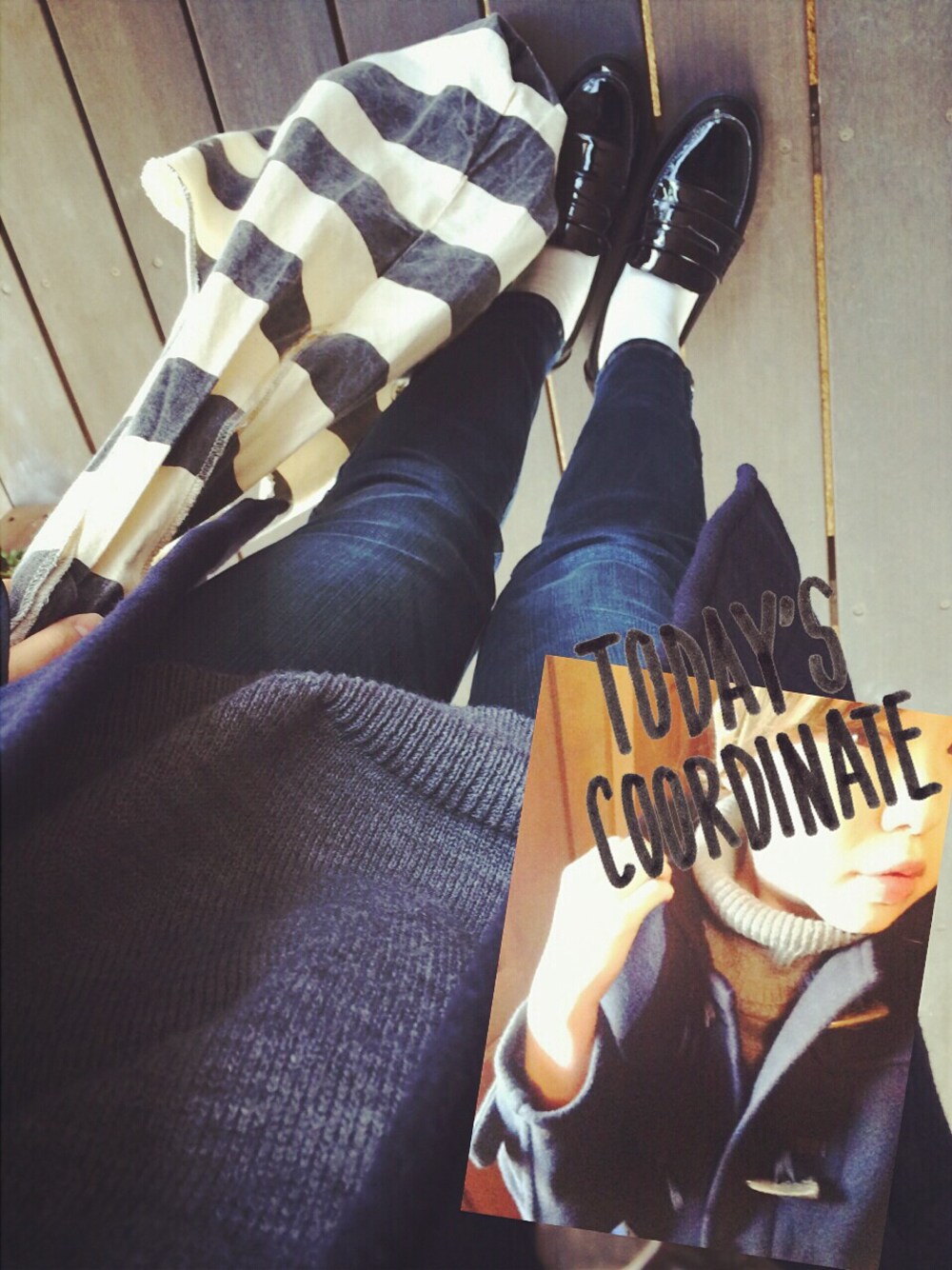シンプルに白ソックスがポイント。 ボーダーのバッグで柄物投入♡ おでかけするならこれにマフラー を巻きたいな🎵