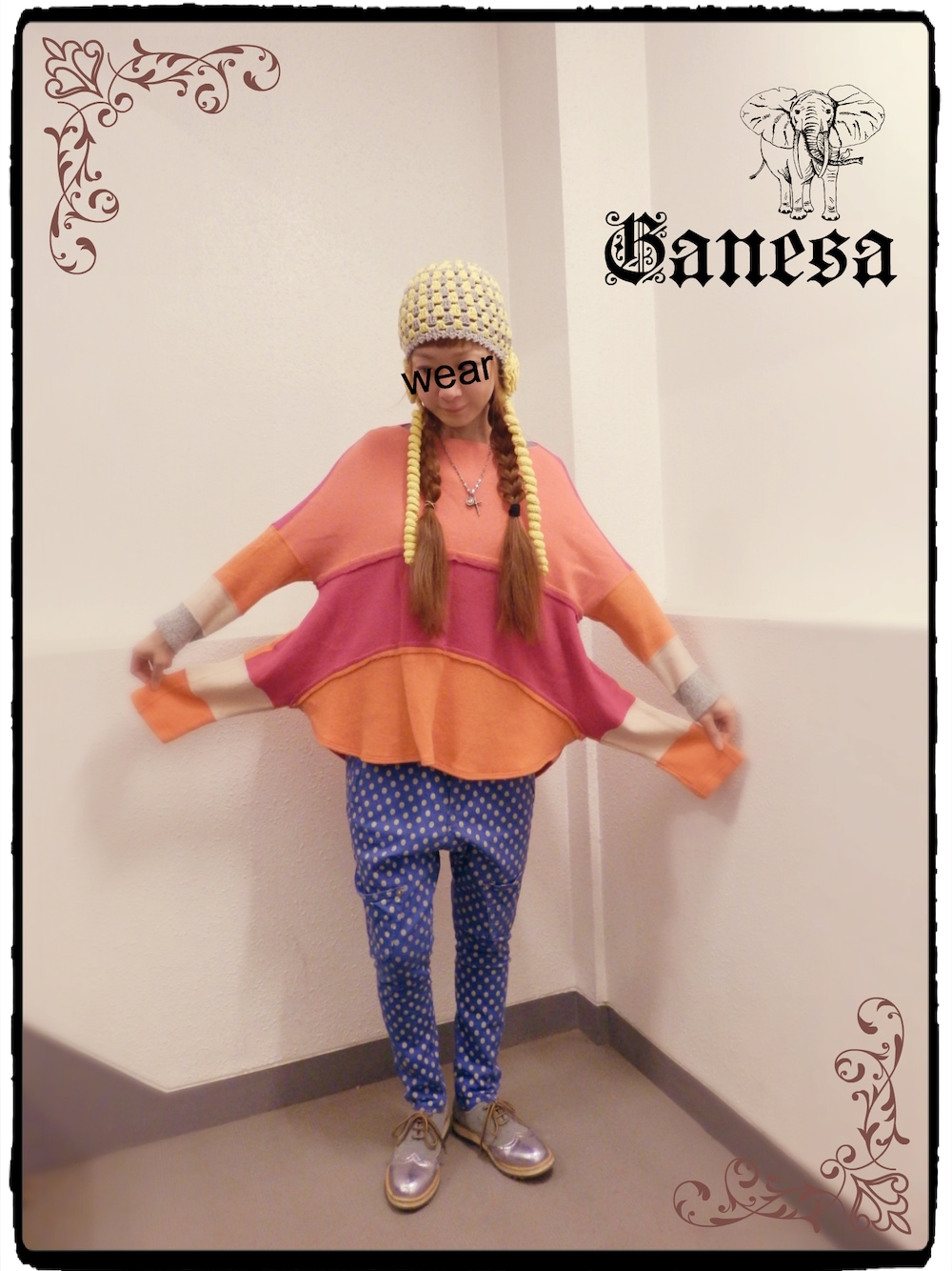 ドットパンツにガネーシャをイメージしたニット♪ 耳あてにくるくるのついたへんてこニット帽で無国籍風(どこが?)