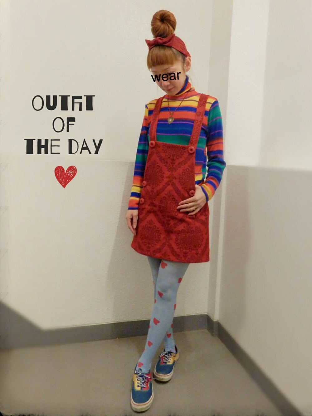 赤いジャンパースカートは丈が短くて寒い。。。 ハート柄のタイツを見せる為に、あえてブーツではなくスニーカーを合わせました★