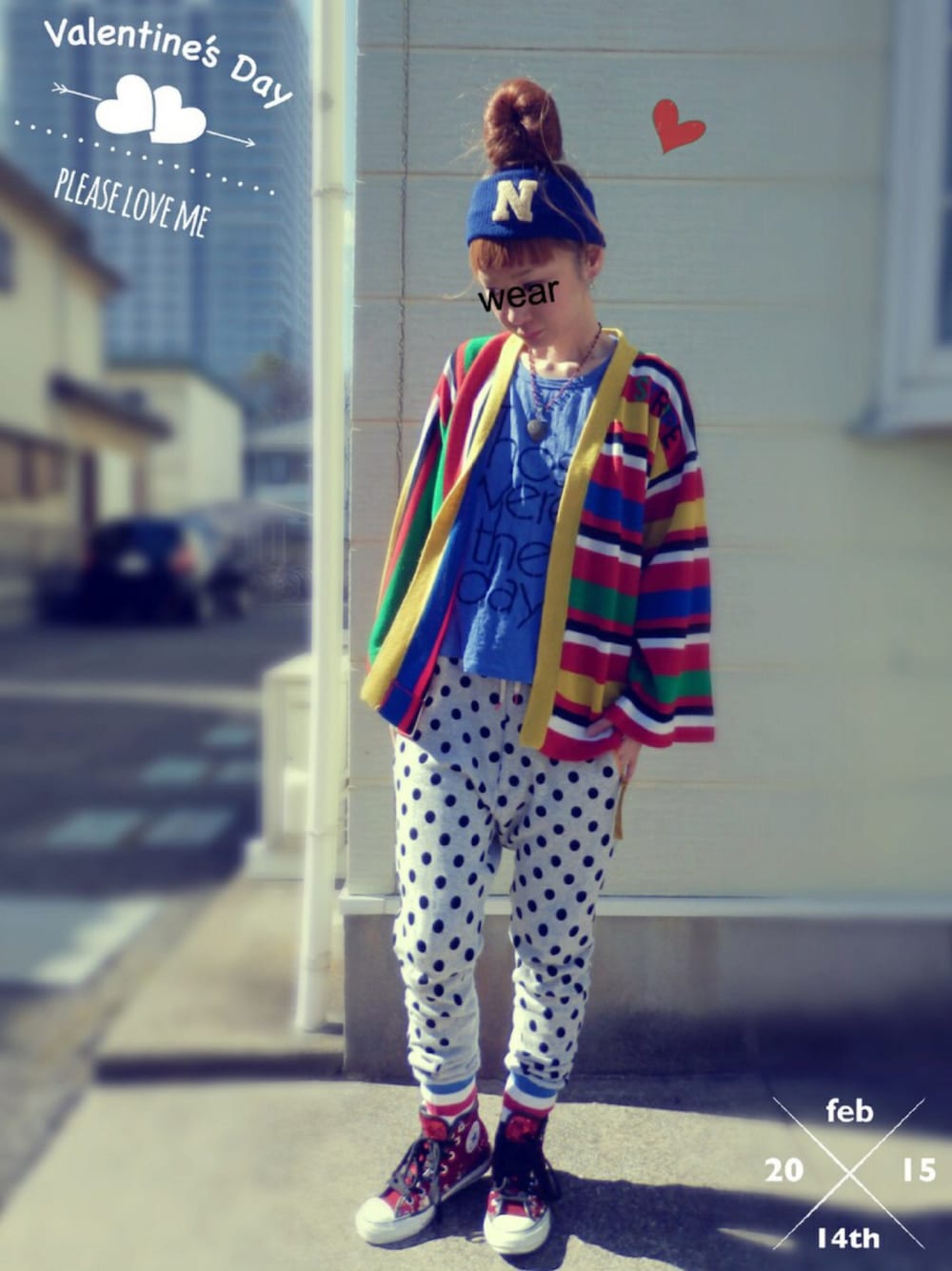 風が強いです〜>_< ストライプ&ボーダーの古着のガウンカーディガンにコンバースコラボのフラボアのスウェットパンツを合わせてリラックスコーデ★ ハートはネックレスで♪ 全くバレンタインっぽくありません… 皆さん素敵なバレンタインを♡