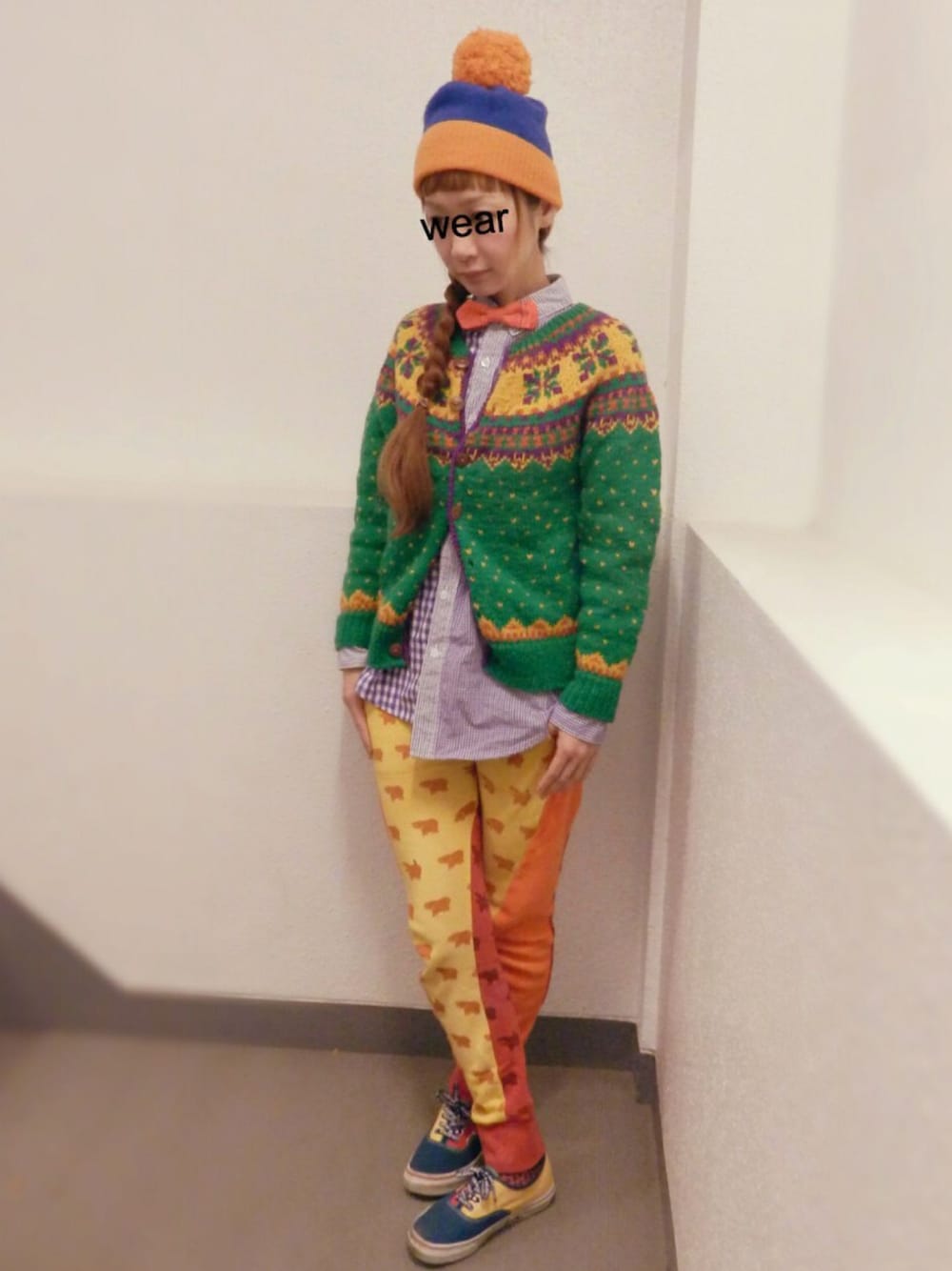 古着みたいなブーのもこもこニットカーデに黄色、オレンジ、赤の切り替えがカラフルなカバさんスウェットパンツであったかコーデ♪ まだまだ寒いです。。。
