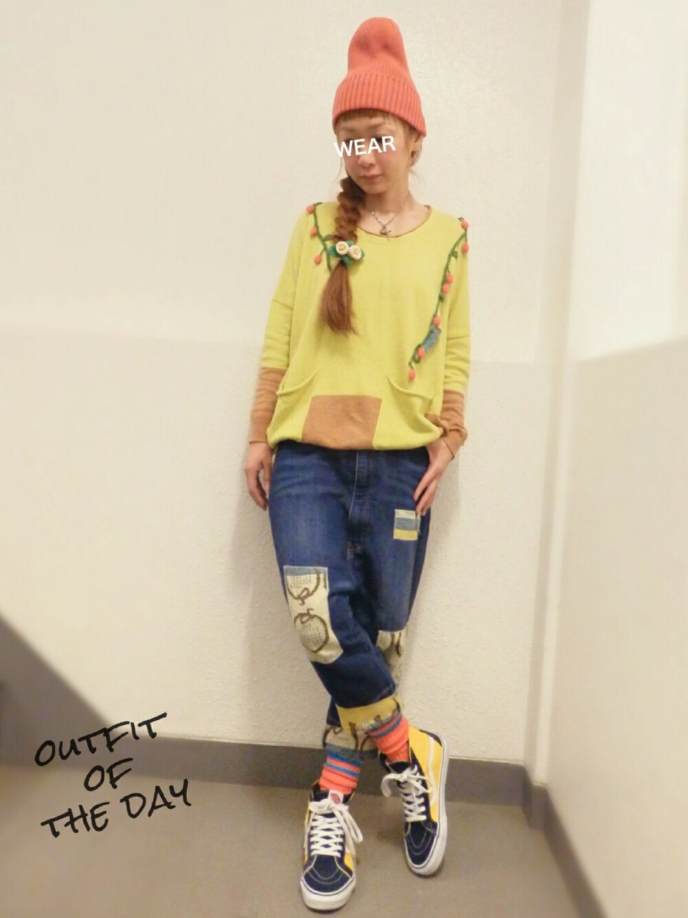 けむしくんと木の実がポイントのニットにカレンダー柄のパッチ付きデニムでゆるゆるらくちんコーデ♫ ようやくあったかくなってきて嬉しいな♡