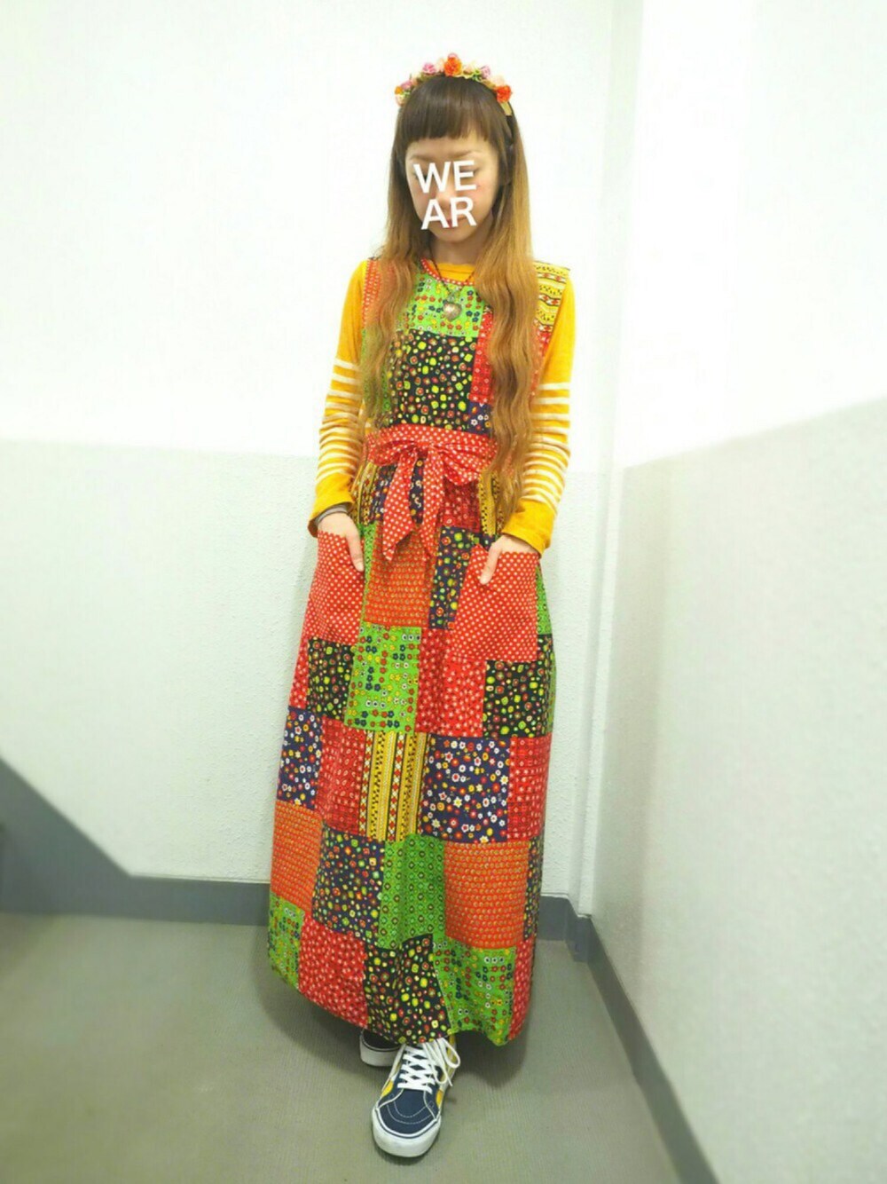 70'sらしいパッチワークの古着ワンピ👗 私にしては珍しいダウンヘアに フラワーカチューシャ💐をつけて ヒッピームードに🌈✨