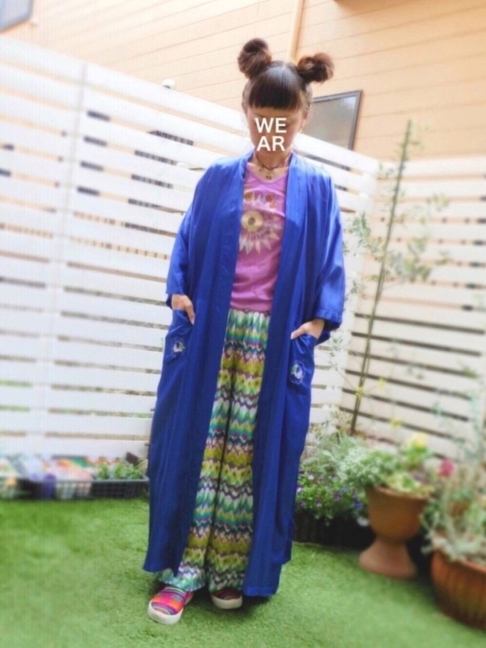 ブルーのチャイナガウンに 孔雀の羽根のような柄のワイドパンツ👖 オリエンタルムードなコーデだったので 髪型もツインお団子で遊んでみました🍡 ガウンもパンツもテロンとしていて 着心地が良いです😊✨