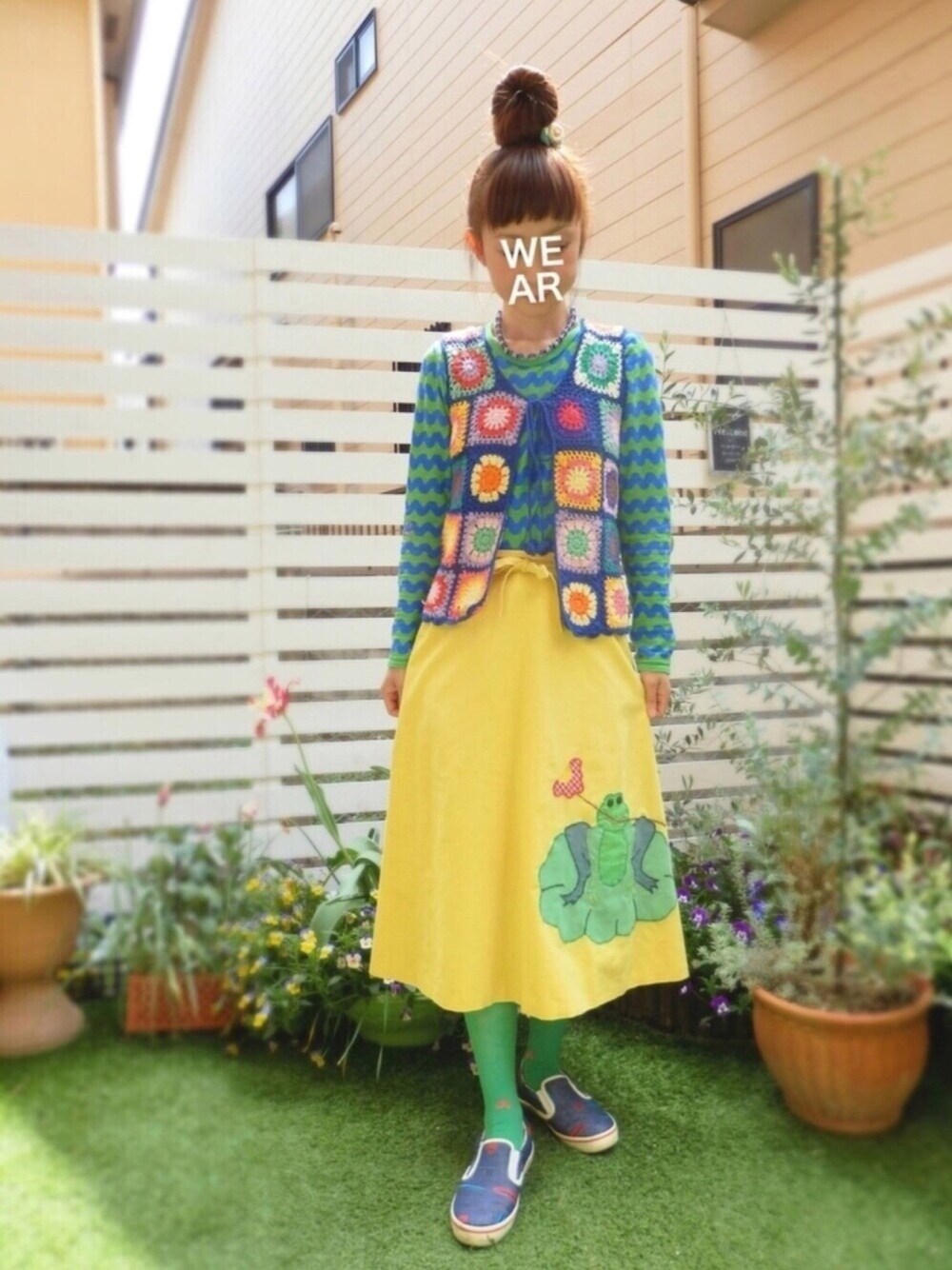 髪を一年振りに切りました✂️ 15センチは切ったのですが あまり気づかれず😅 でも気分はスッキリしました😆✨ 服はカエルがポイントの巻きスカートに 頂き物のカラフルな鍵編みベストを重ねて おばあちゃんぽい感じです👵