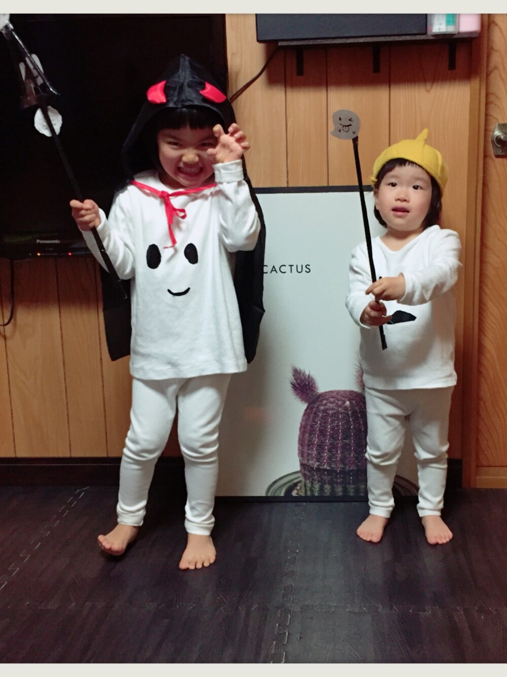 はっぴーはろうぃん🎃 こどもたちがハロウィンハロウィンうるさいので、やっつけハロウィン。笑 次女が自分で選んだマントを直前で嫌がったので、白Tにガムテープ。笑 姉ノリノリやん。