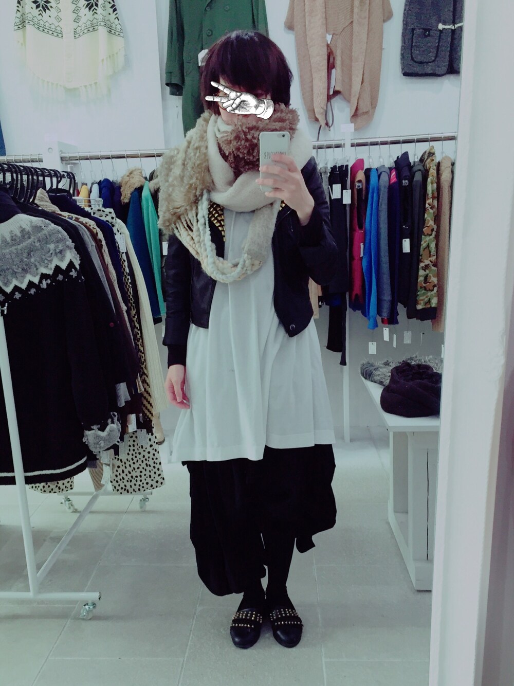 今日の出勤コーデ\(^o^)/ ここ数日で急に冷え込んできましたね。 スタッズ馬鹿時代に買った、ライダースと靴を久しぶりに◇◇ 他はビックシルエットで楽ちんーです(OvO) 超ロングスヌードでぐるぐる三重巻き◎ MIFUNEのスヌードはあたたかくて、可愛いのである(OvO)首元ぬくたい!